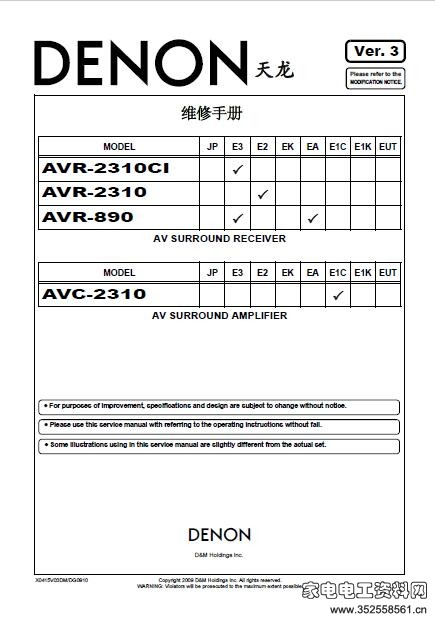 天龙 Denon AVC-2310 维修手册适用机型:Denon AVR-2310CI  Denon AVR-2310 Denon AVR-890